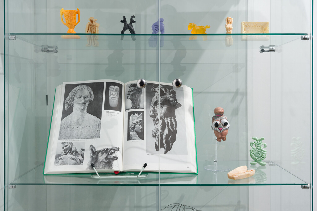 Just About in the Round is a curatorial exercise. Themes explored here are, in the broadest terms: embellishment; feathering (to smooth or blur the edges of a feature); sculpture and modeling; in-the-roundness; plasticity; and animation, or the conscious attribution of agency to inorganic objects.