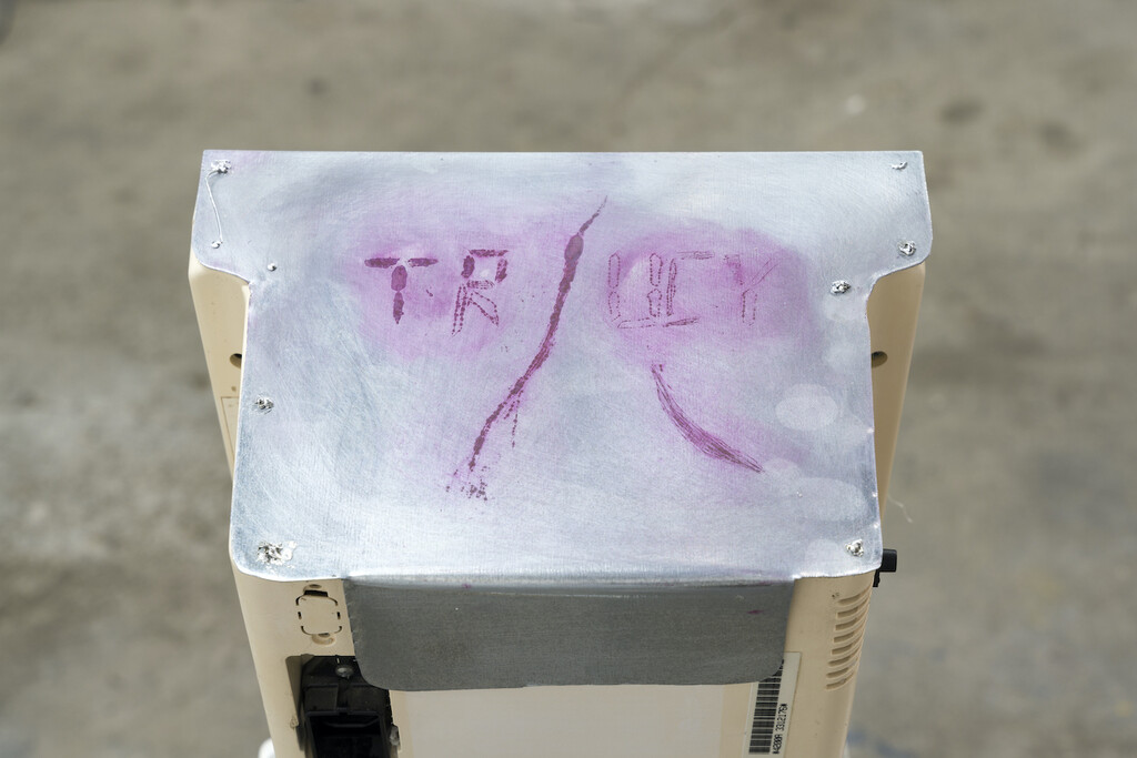 Representative Of Happinus Limut VII (detail), 2021, Designer trash can etched with acid, Japanese toolbox, receipt paper, patient monitor, electronic components, interior wall paint, hardware, 58.75 x 15 x 15 in.