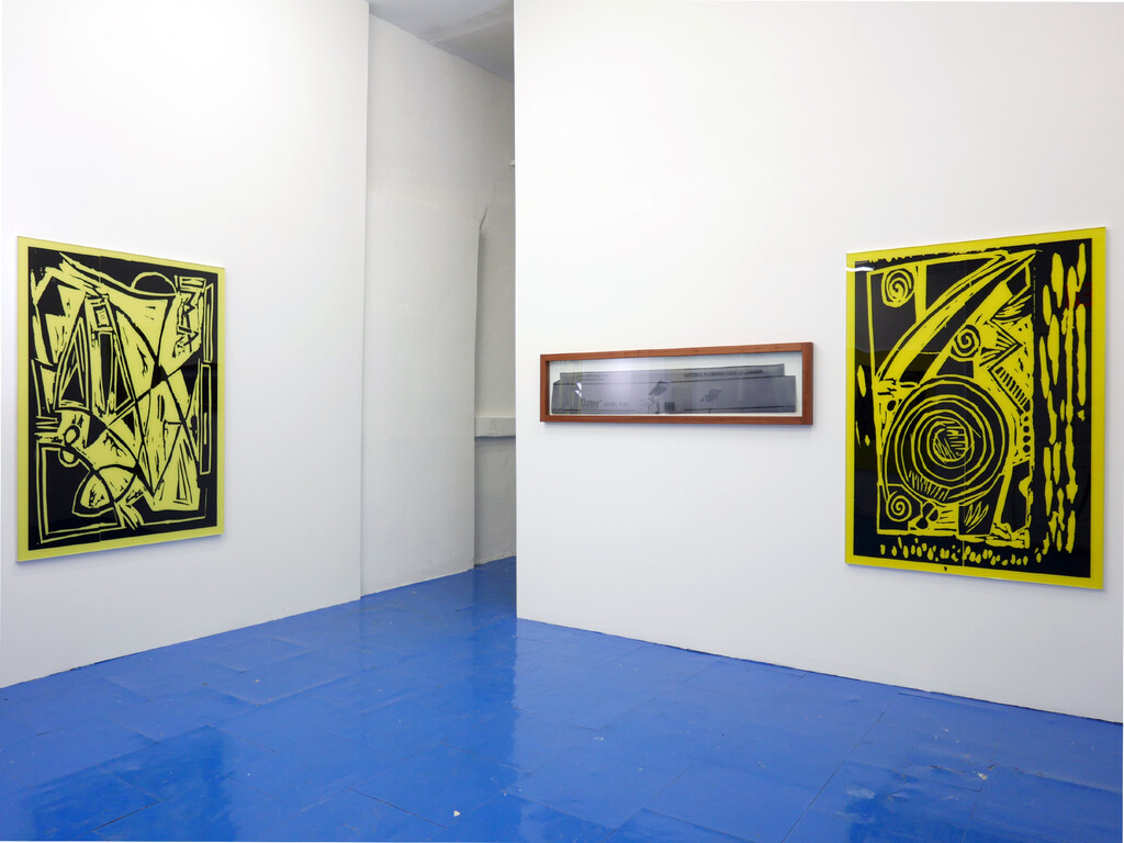 The initial sense I get is that these two artists are both interested in, and repulsed by, this kind of failed or heavily tortured communication. There is the legally obligated government warning, whose tone is dictated by avoiding liability. And then there are the swirls and random energy markings of the woodcuts—which have more in common with clip art than the ancient cultures they are presumably meant to evoke.