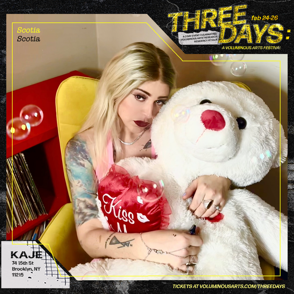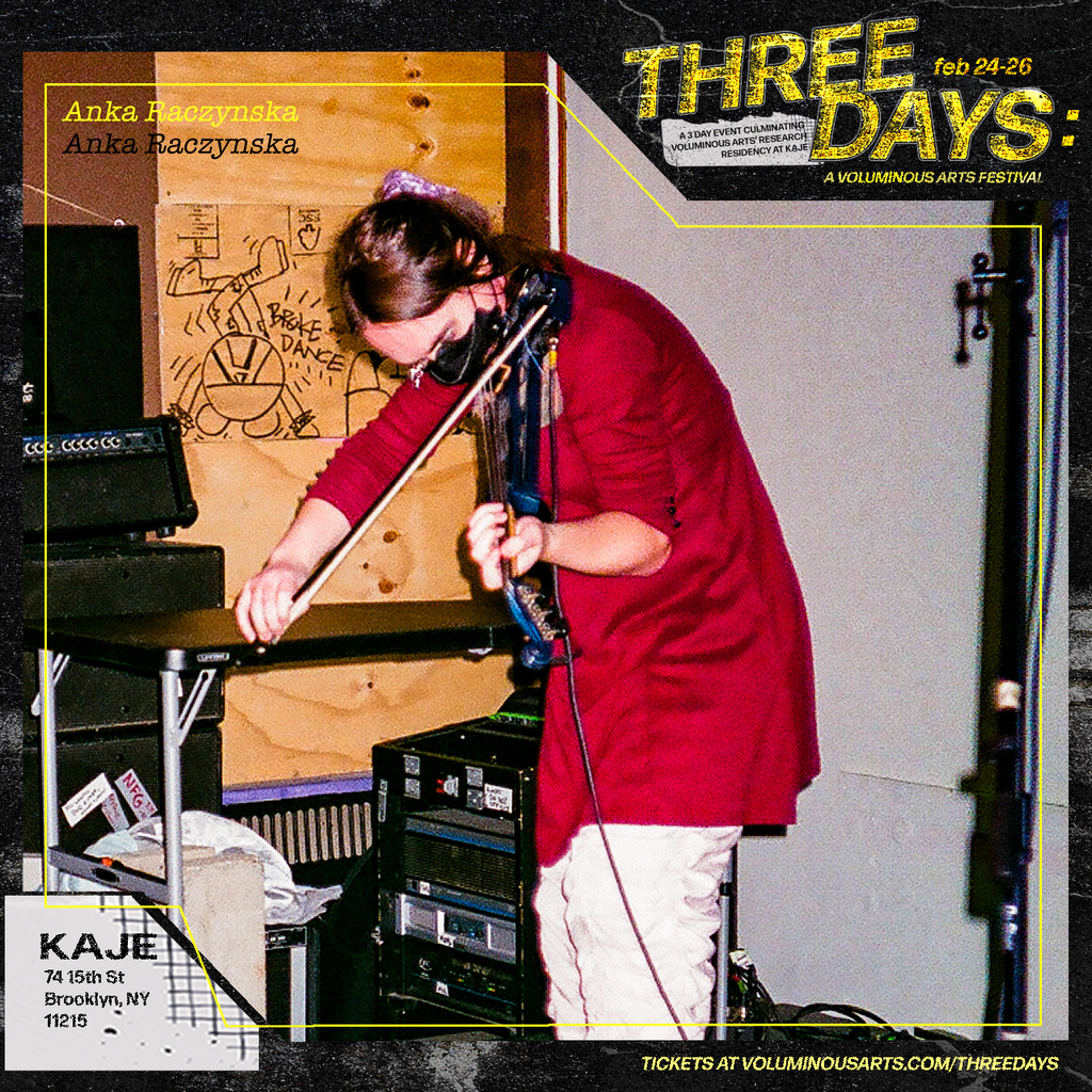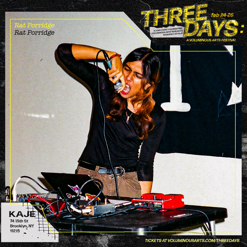 Three Days: A Voluminous Arts Festival was a weekend-long music and arts festival that took place at KAJE from Feb 24-26, 2023 and centered on trans artists experimenting with music and sound. Designed as a multisensorial experience where aural and visual components weaved themselves through communal episodes, the festival was both an exhibition and a celebration. Since most of the research residency’s activities had not been open to the public, this event acted as a showcase of the work developed—while simultaneously being a weekend-long party for the public and the artists involved. Three Days provided a glimpse into the work Voluminous Arts’ artists had developed during their research residency at KAJE from September 2022 to February 2023.