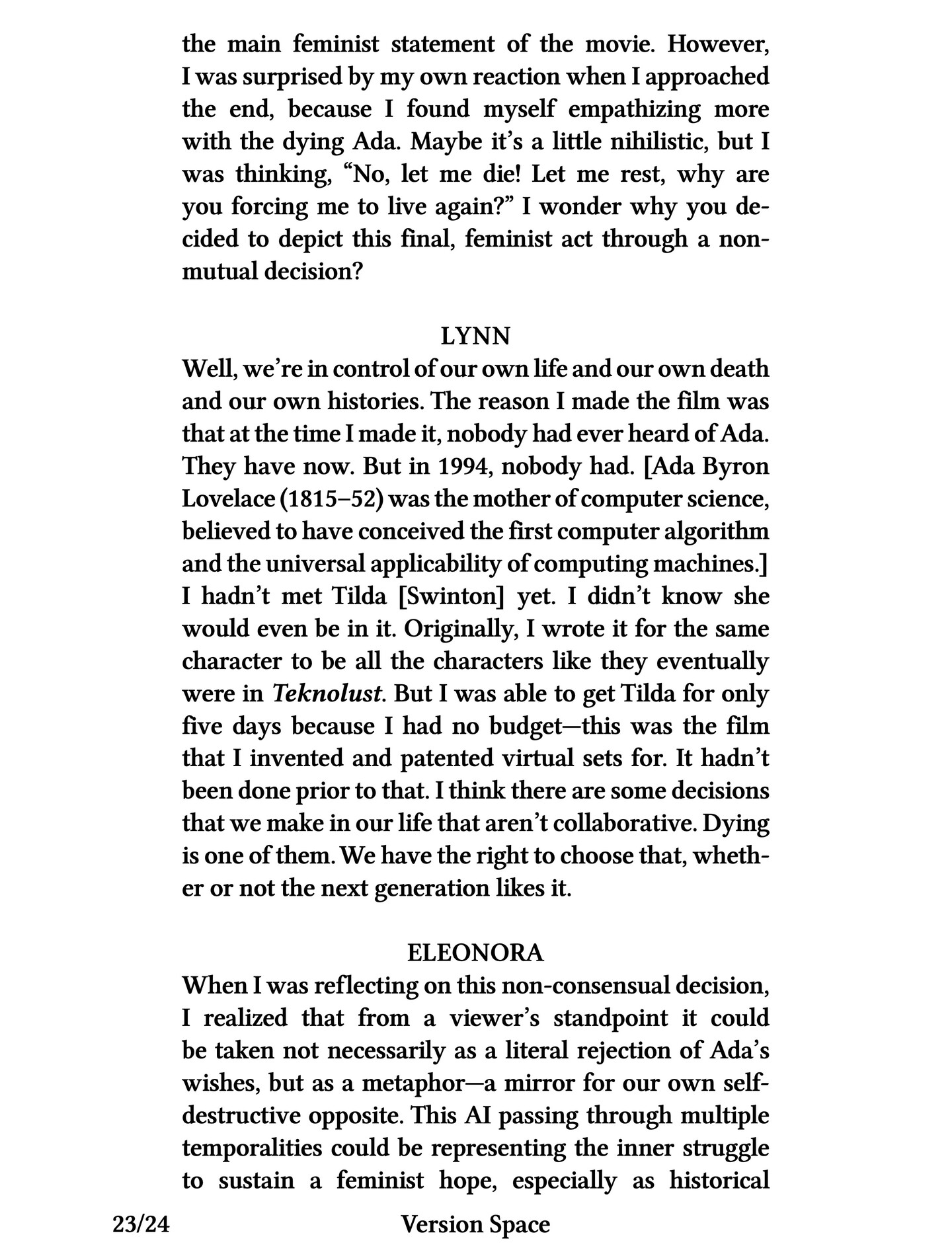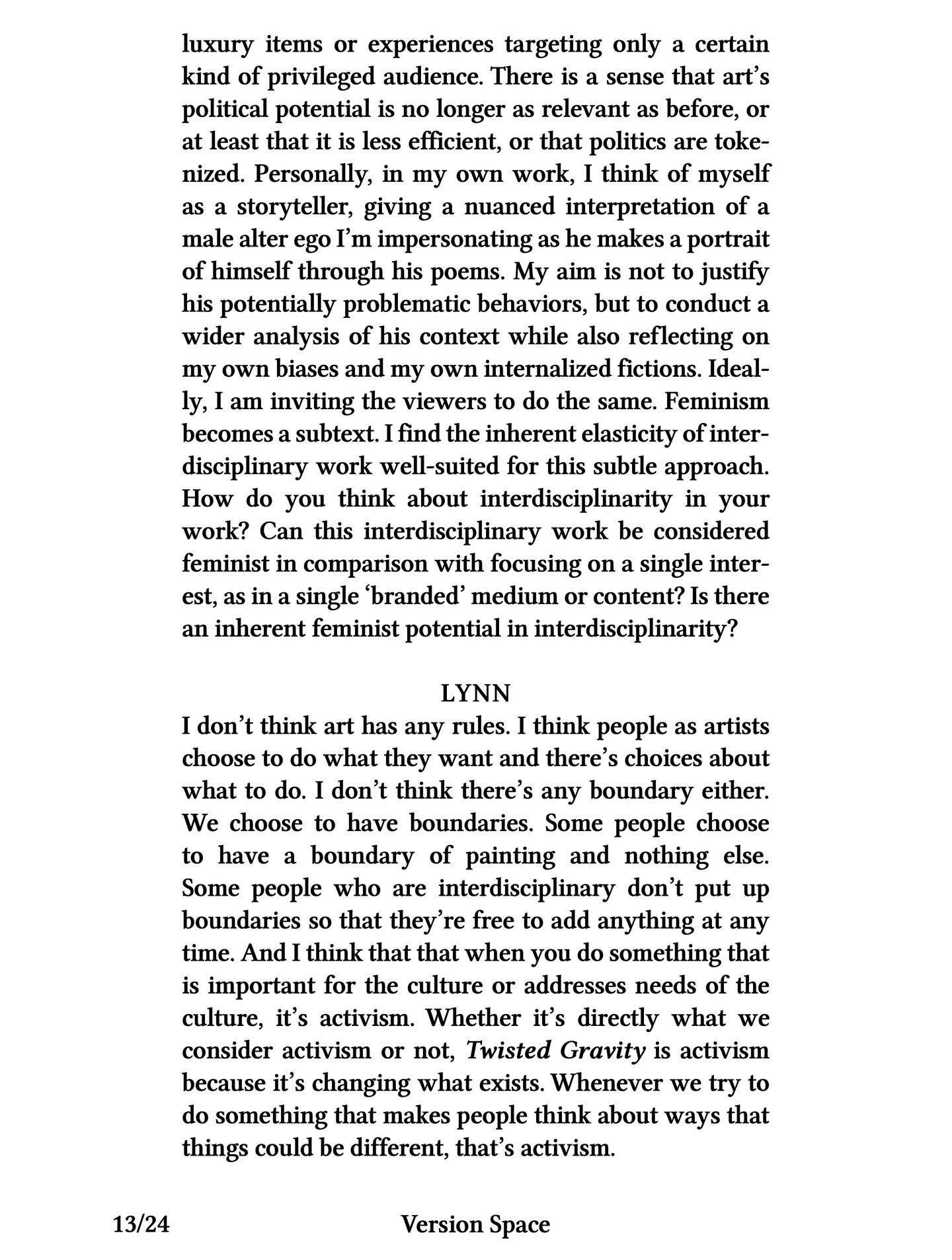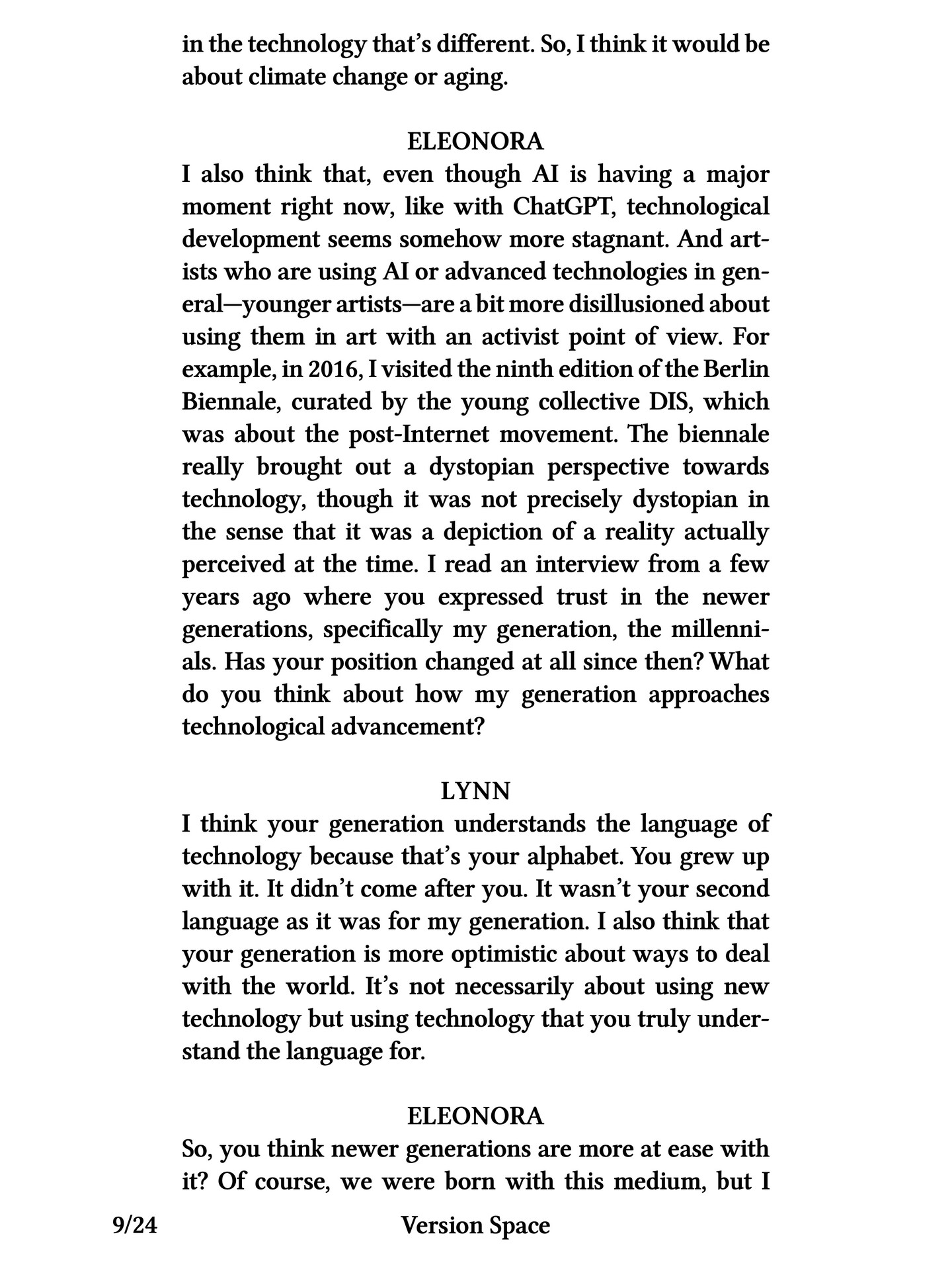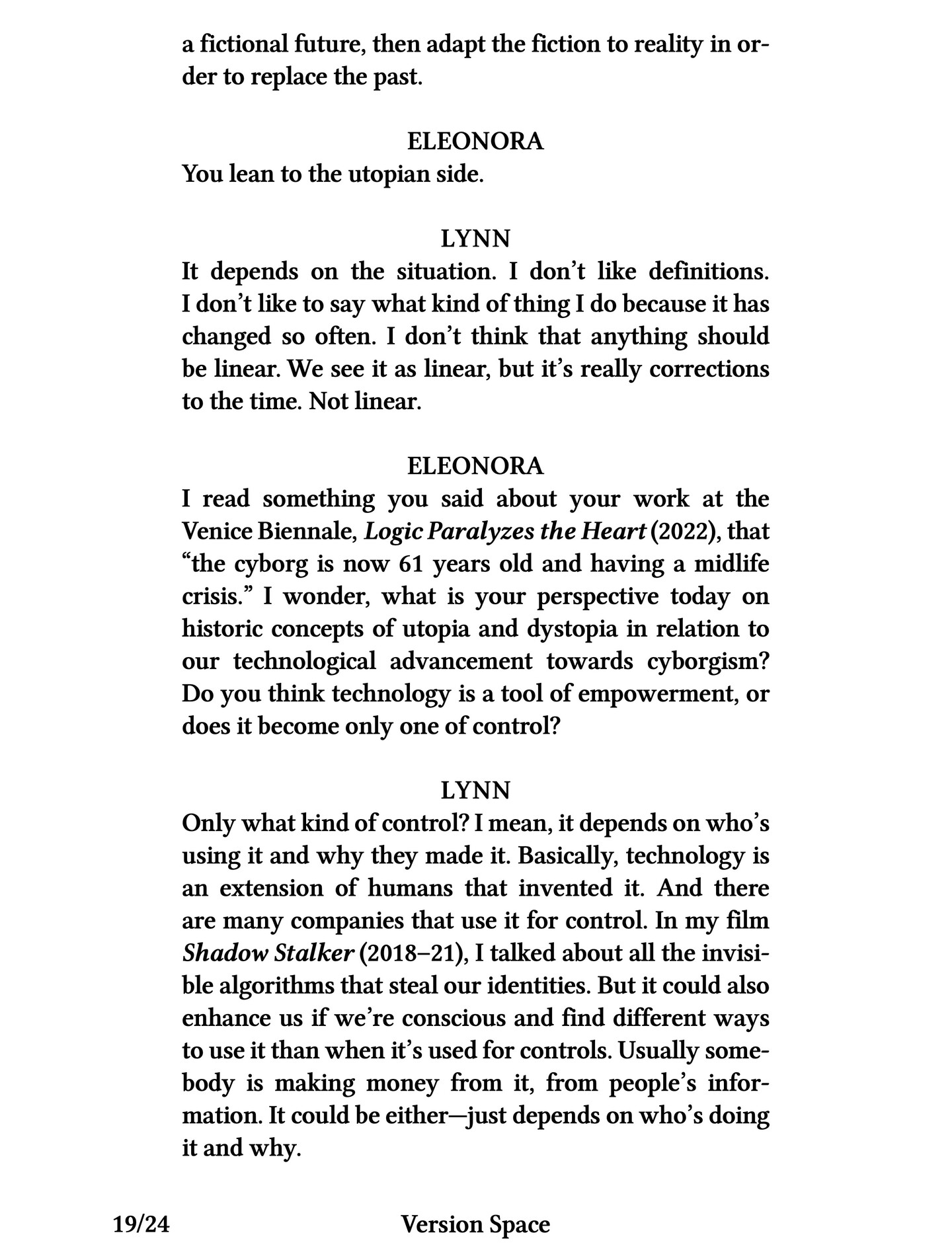 Version Space is a series of pamphlets transcribing conversations among artists and graduate students in visual art regarding Artificial Intelligence and related topics, originally produced in collaboration with Library Stack and funded by the Artistic Research program of the Sandberg Instituut, where I was a research fellow in the Department of Fine Arts for the academic years 2018–19 and 2019–20, with additional support from KAJE, where I was a 2023 Think Tank resident. The conversations take place via videoconference, are recorded, transcribed by an AI, then edited for clarity by humans, including myself and the participants. The series title is borrowed from a machine learning framework conceived in the 1980s as a technique for identifying a range of possibilities in the overlap between maximally general and maximally specific hypotheses.