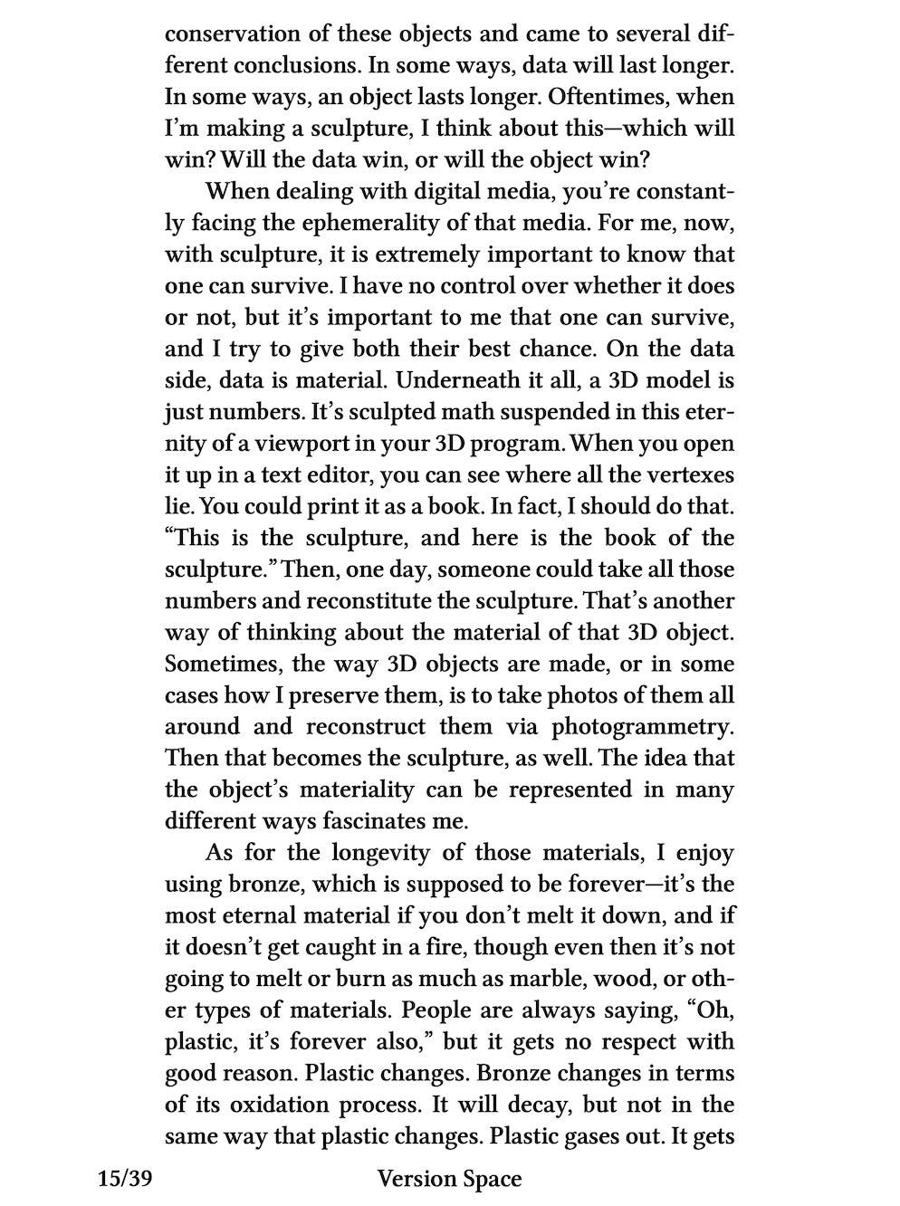 Version Space is a series of pamphlets transcribing conversations among artists and graduate students in visual art regarding Artificial Intelligence and related topics, originally produced in collaboration with Library Stack and funded by the Artistic Research program of the Sandberg Instituut, where I was a research fellow in the Department of Fine Arts for the academic years 2018–19 and 2019–20, with additional support from KAJE, where I was a 2023 Think Tank resident. The conversations take place via videoconference, are recorded, transcribed by an AI, then edited for clarity by humans, including myself and the participants. The series title is borrowed from a machine learning framework conceived in the 1980s as a technique for identifying a range of possibilities in the overlap between maximally general and maximally specific hypotheses.