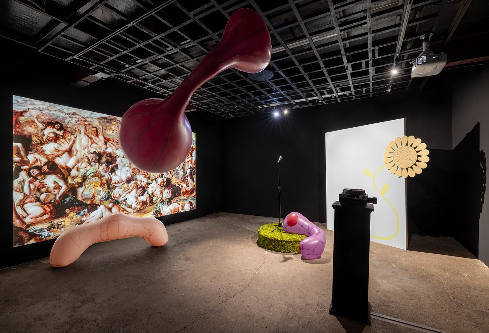 In “The Vanishing Dialectic: Shulamith Firestone and the Future of the Feminist 1970s,” Kathi Weeks suggests that the artificial womb concept in Firestone’s earlier text acts like a novum—a scientifically plausible technological innovation that drives science fiction narratives and their corresponding cognitive estrangement. Ruhl’s installation environment evokes the basis of Firestone’s reproductive utopia with inflatable sculptures that serve both as projection screens and, in the context of performance, as noise-generating instruments.