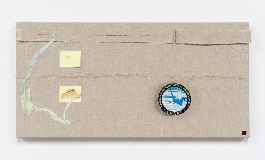 "TWIN INFINITIVES" C.R.A.N.E. Edition, 2022, polyester machine embroidery, polyester hand embroidery, acrylic, New Models Codex Y2K20 sticker, and collage on linen, 11 x 22 inches
