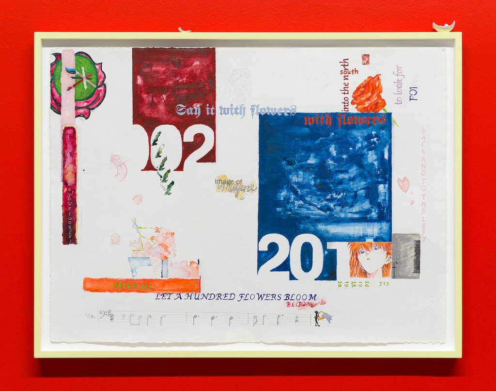 say it with flowers Like LET A HUNDRED FLOWERS BLOOM Like imagine!, 2020, gouache, egg tempera, watercolor, pencil, Urban Decay "ZERO" pigment, and acrylic on gessoed paper in maple frame painted Pantone 11-0618 TCX Wax Yellow, 24 x 32 inches
