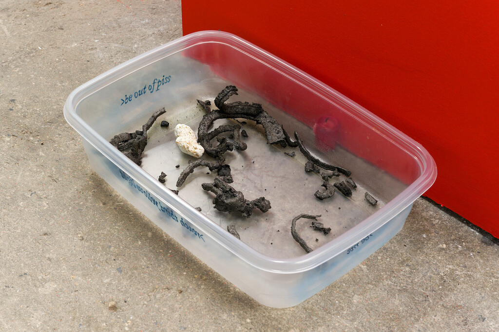 Don't Jump - Pool's Drained, Closed (after [>be me >reach third yellow light...]), 2022, rubber gecko, rocks, candle, found drawing, Swarovski crystals, drypoint on plastic Tupperware, coral, ash, dimensions variable