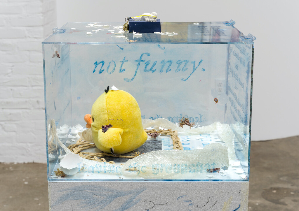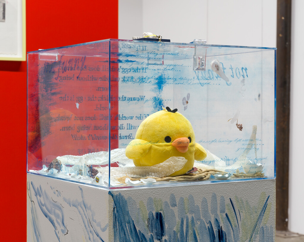 The Unfunny Yellow Bird, feat. omens, 2021, egg tempera, gouache, charcoal, and primer on wood; drypoint on Plexiglas, book snakes, eggshells, snakeskin, epoxy, dried cherry blossoms, wax, graphite, Kiiroitori San-X Original Plush, and charm, 45 x 13 x 13 inches