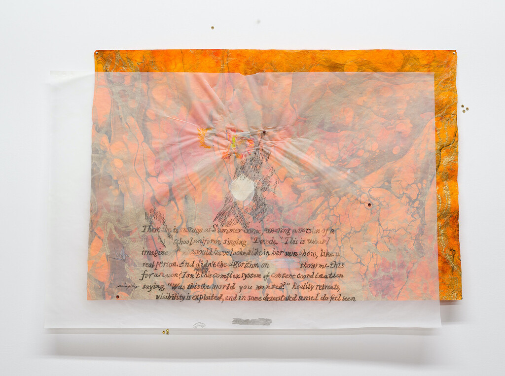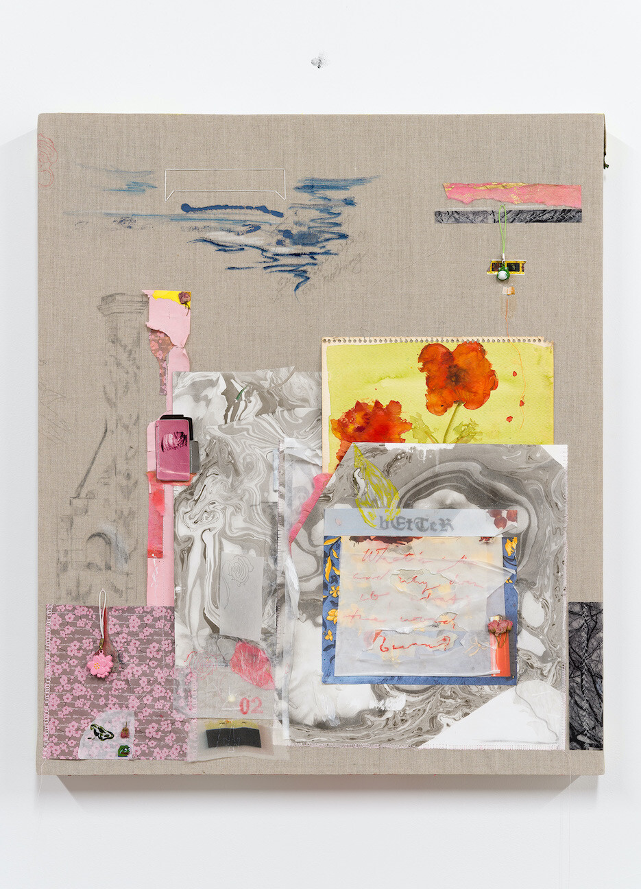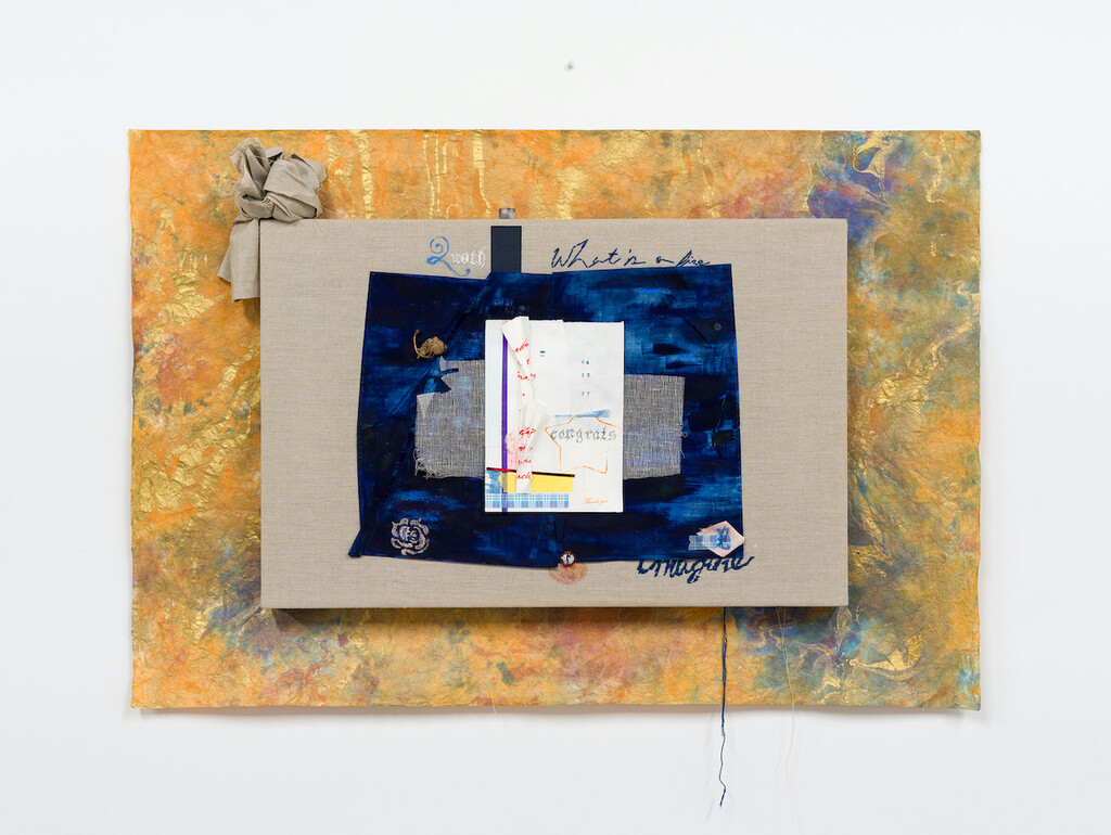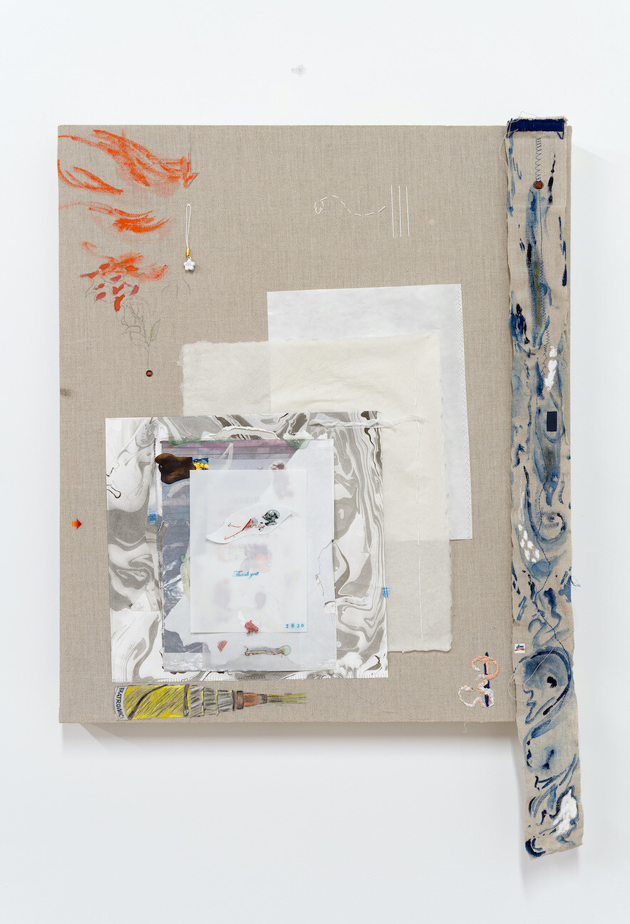 Congrats/Thank you, 2021, egg tempera, pencil, ink, and tape on mulberry paper, book-binding net, bookcloth, dried cherry blossom, oil pastel, water-soluble colored pencil, collage, and cotton embroidery on linen with ash-covered sugar cube and hand marbled paper, 24 1/2 x 35 3/4 inches