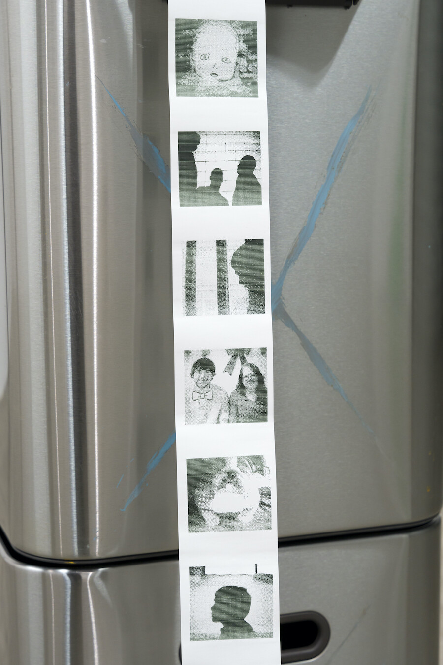 Representative Of Happinus Limut VII (detail), 2021, Designer trash can etched with acid, Japanese toolbox, receipt paper, patient, monitor, electronic components, interior wall paint, hardware, 58.75 x 15 x 15 in.