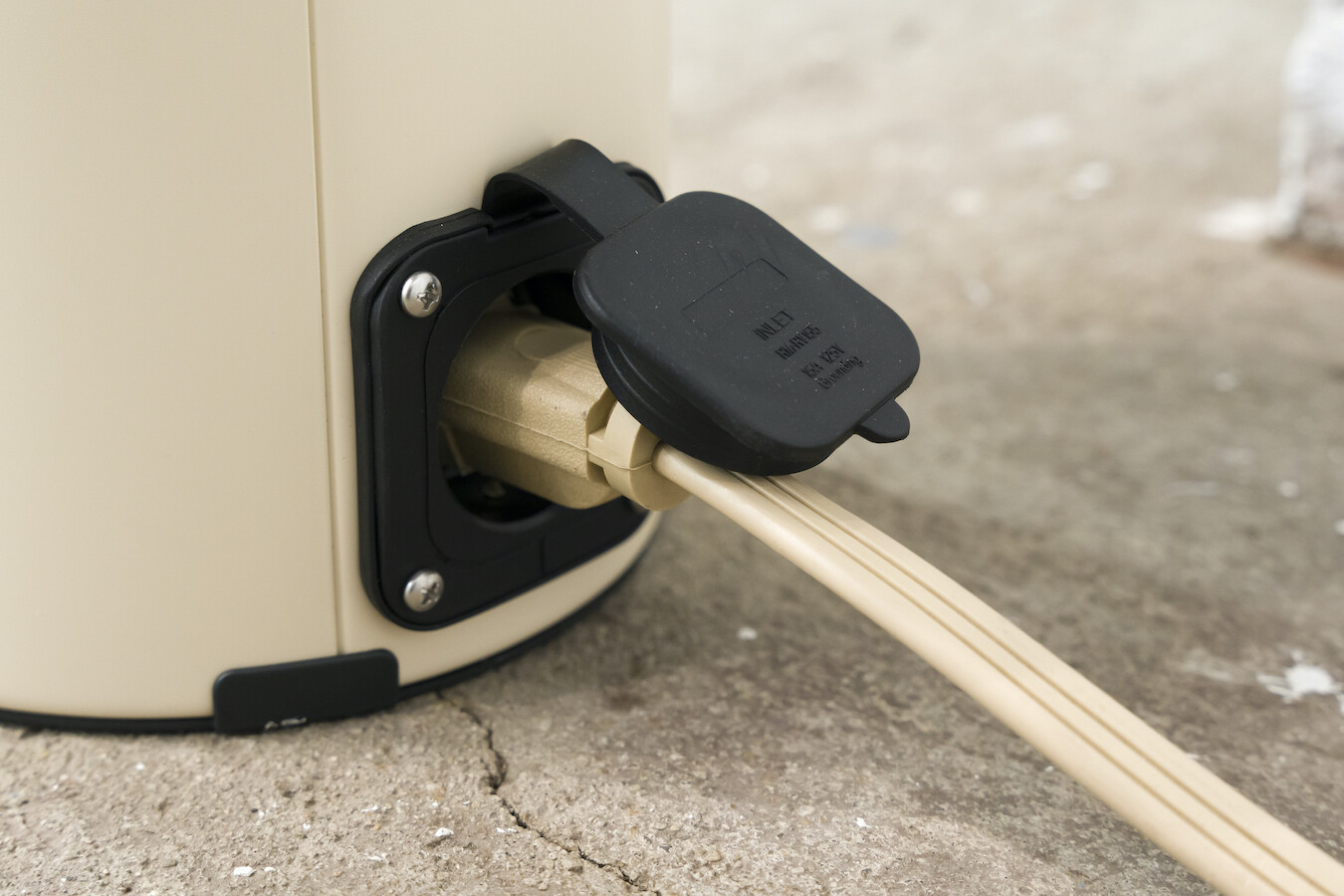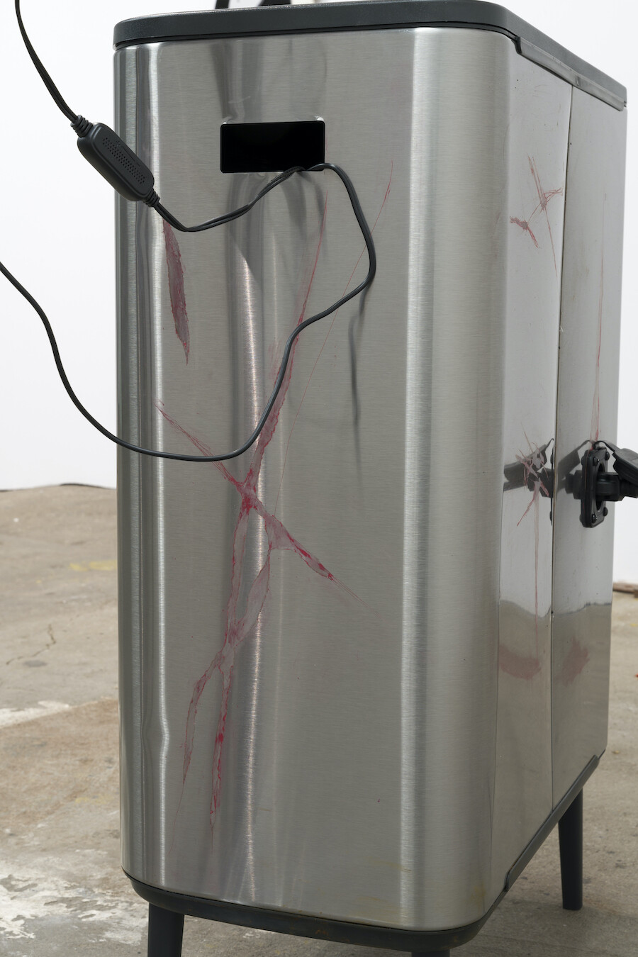 Iron Blue Orphan (detail), 2021, Trash can, patient monitor, electronic components, hardware, 17.5 x 8.5 x 9 in.