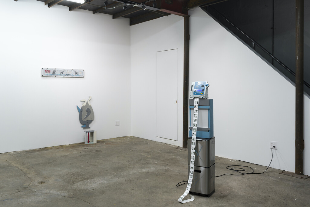 Representative Of Happinus Limut VII, 2021, Designer trash can etched with acid, Japanese toolbox, receipt paper, patient monitor, electronic components, interior wall paint, hardware, 58.75 x 15 x 15 in.