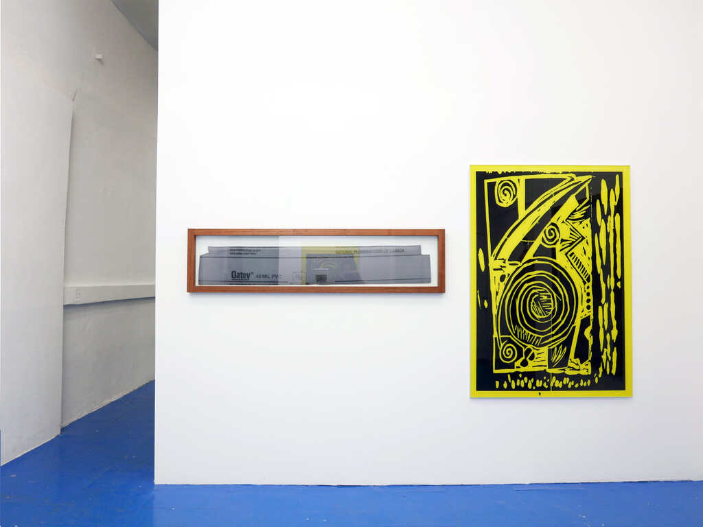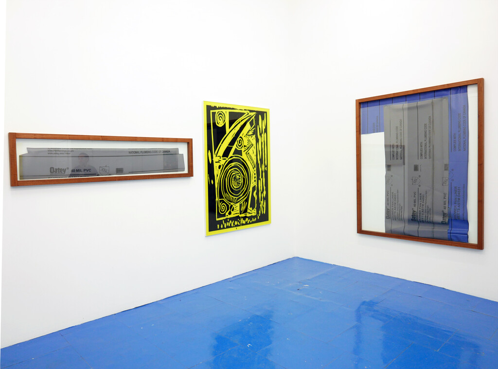 the show of Andy Meerow and Rose Marcus, two friends in conversation. The pieces are as follows: Andy has taken photos of some small woodcuts of swirls and 90s world market looking signifiers, which were hanging in his therapist’s office. He blew them up, transferred the images into high contrast vinyl decals mounted on plexiglass, and painted a sickly yellow behind them. Rose has hand-made high-end mahogany frames and they are sitting around and a little on top of roughly cut shower liners which display a government health warning in a sensible font. These liners are stapled directly to the wall.