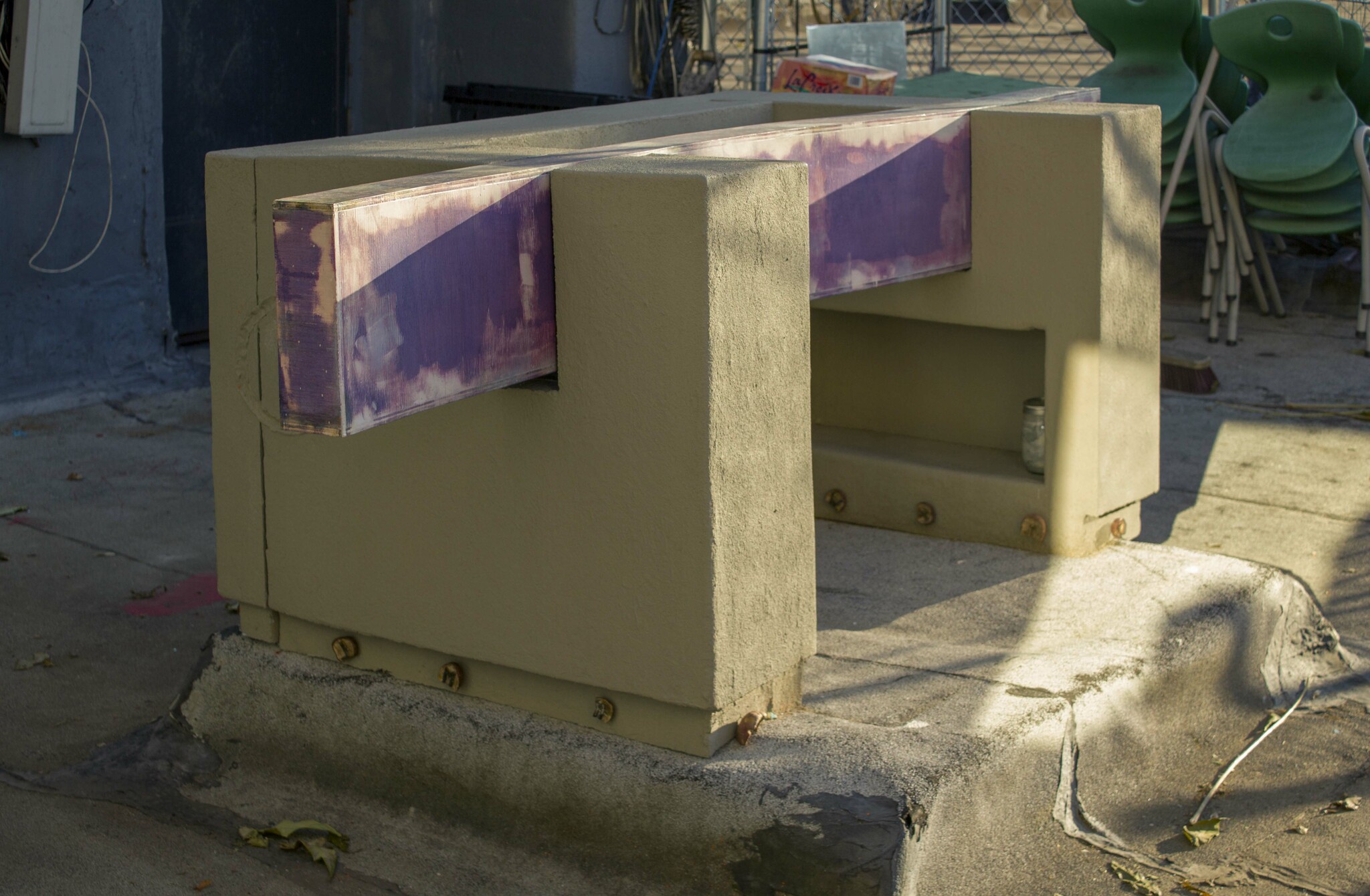 Archipelago is a project comprised of five kitchen islands at various sites around NYC—these islands; DOCK, STAGE, STATUE, STORAGE, and FOUNTAIN are meant to activate the concept of an open floor plan (a class-aspirational trope), as well as the metonymic properties of each of the pieces' locations and titles respectively. FOUNTAIN, for example, is an island made for toddlers (fountain of youth) and its location (the unused courtyard behind a Lower East Side gallery) reminds us of discarded toys, hidden away, left to the elements. STAGE (at Hunter College Art Galleries in conjunction with a Robert Morris show) has the faux-finish of a theaterprop with an unsightly black top—freshly painted for opening night. The piece is in an adjacent space to the main gallery that is semi-public and often used by the school for voting. STAGE evokes Robert Morris' 1972 sculpture, Hearing, (interchangeably a sentencing room, or a psychiatrist's office) in that it is both functional (the drawers and cabinets all open and close), and latent until activated by its actors.