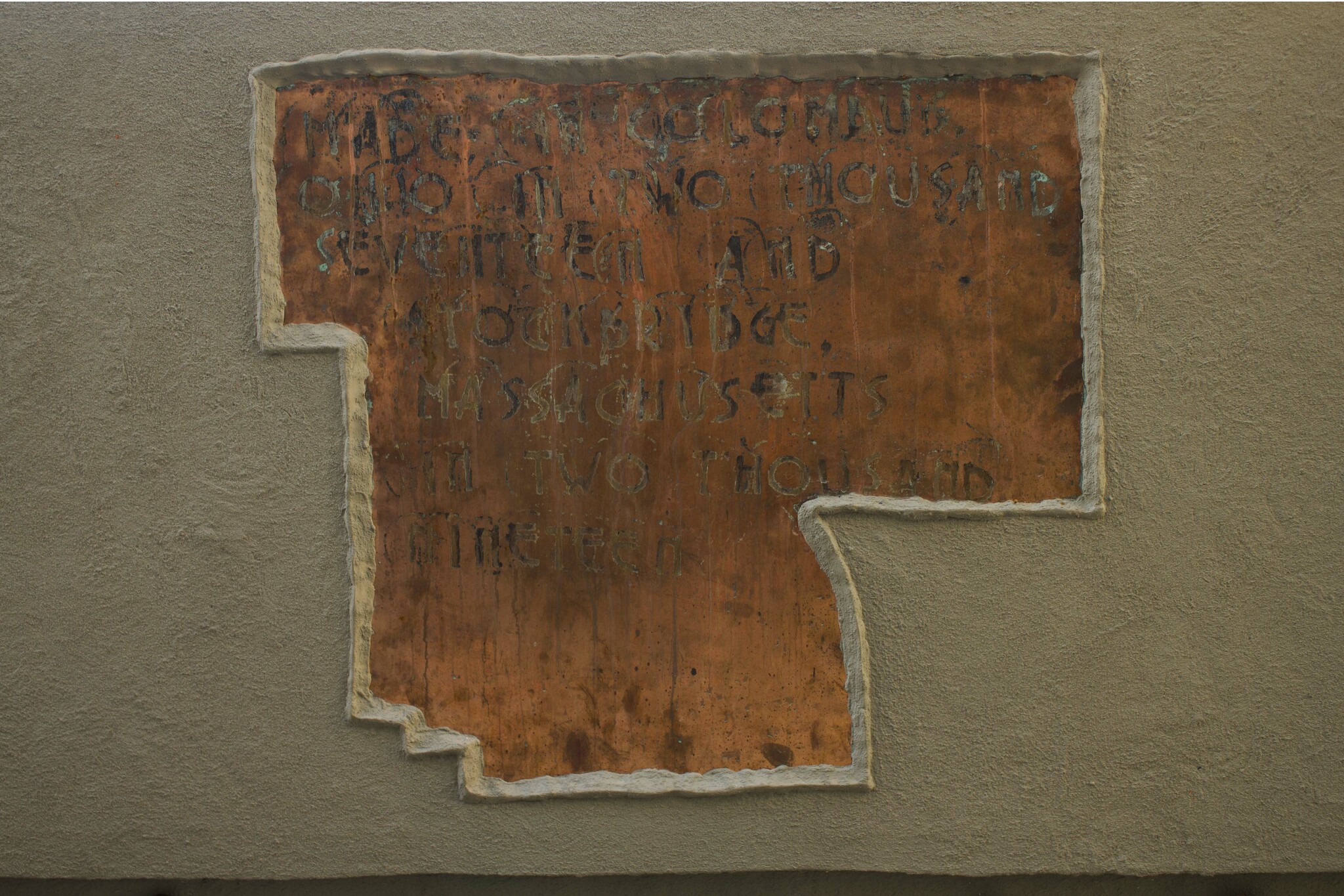 STATUE, on the rooftop of La Kaje, is a horizontal monument. An etched copper placard, bearing potato-printed letters (this alphabet of matrices line the toe kick of the sculpture) reads the where and when of its construction. It will be up through November, concurrent with the onset of NYC early winter, as we begin to take refuge in our prospective shelters.