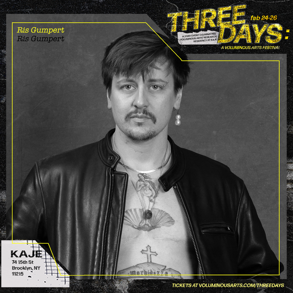 Three Days: A Voluminous Arts Festival was a weekend-long music and arts festival that took place at KAJE from Feb 24-26, 2023 and centered on trans artists experimenting with music and sound. Designed as a multisensorial experience where aural and visual components weaved themselves through communal episodes, the festival was both an exhibition and a celebration. Since most of the research residency’s activities had not been open to the public, this event acted as a showcase of the work developed—while simultaneously being a weekend-long party for the public and the artists involved. Three Days provided a glimpse into the work Voluminous Arts’ artists had developed during their research residency at KAJE from September 2022 to February 2023.