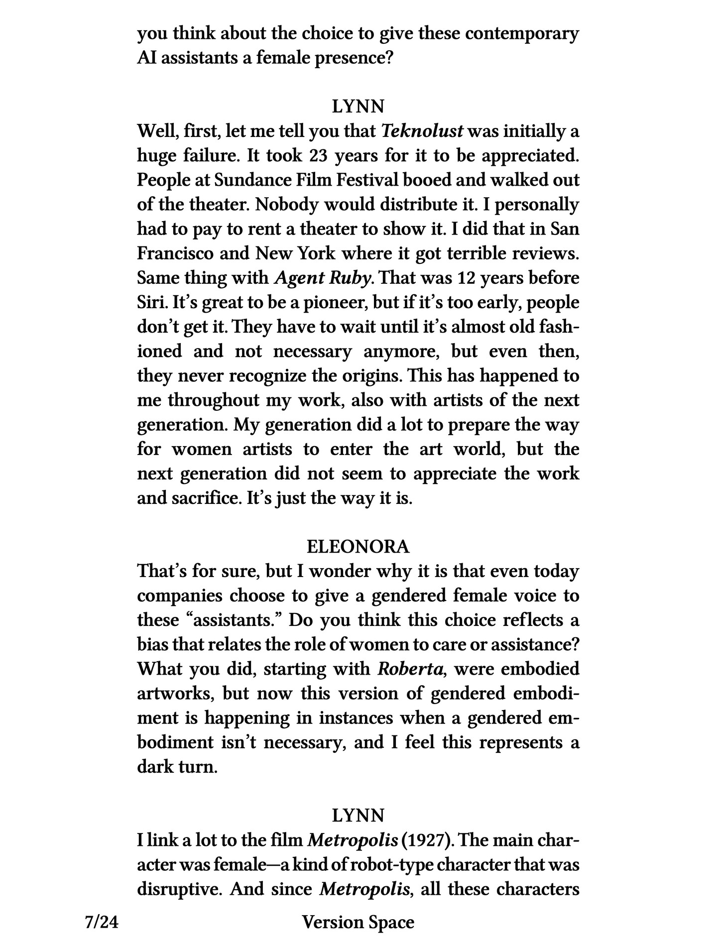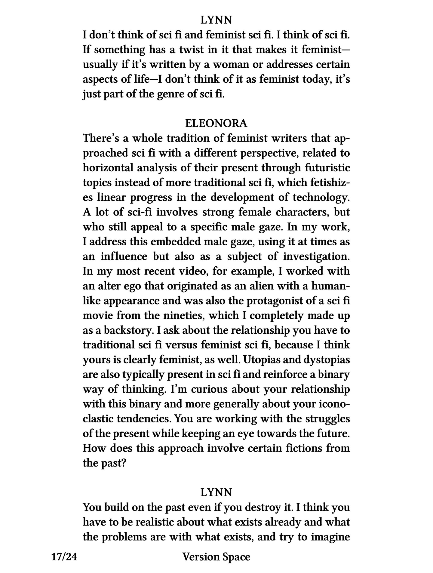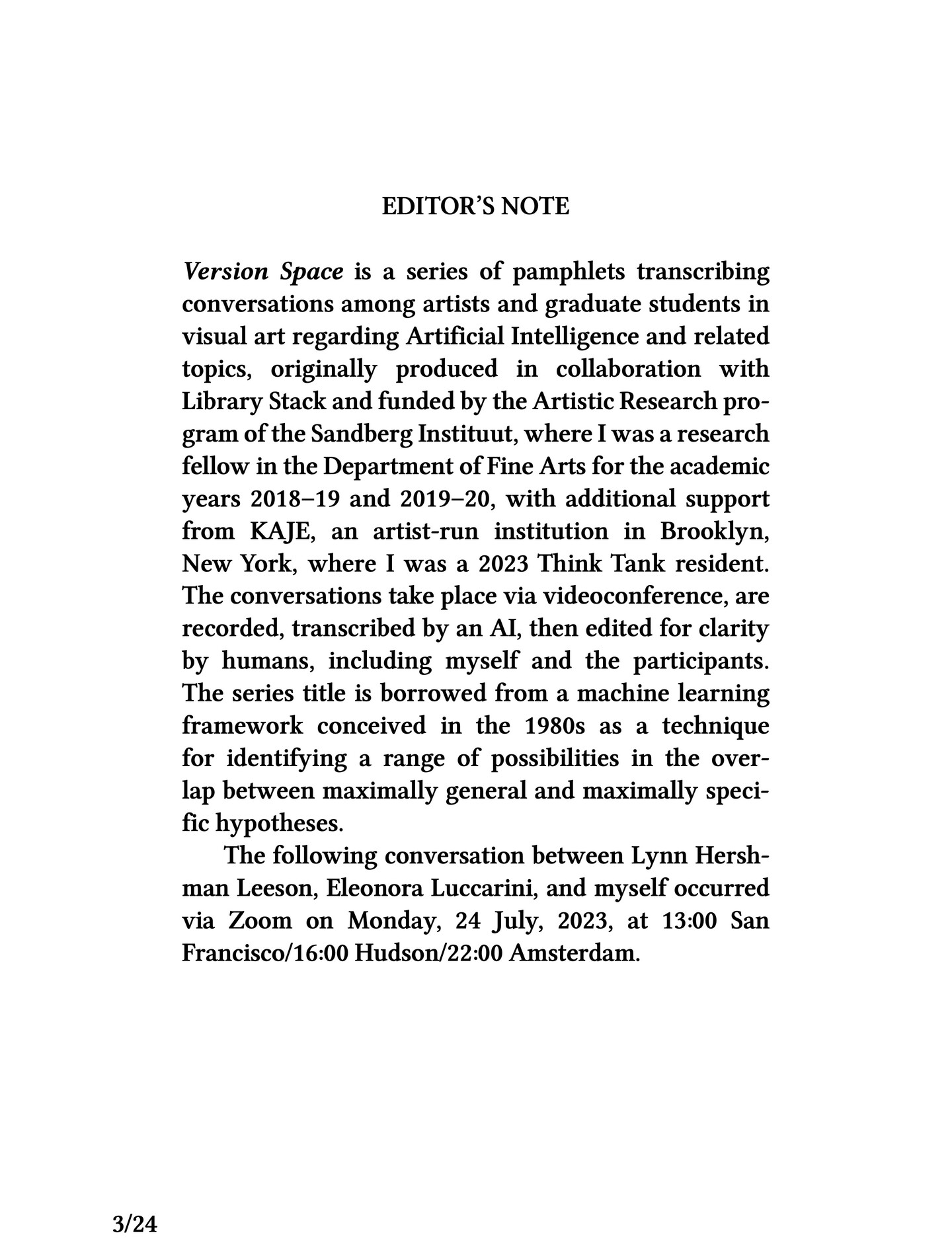 Version Space is a series of pamphlets transcribing conversations among artists and graduate students in visual art regarding Artificial Intelligence and related topics, originally produced in collaboration with Library Stack and funded by the Artistic Research program of the Sandberg Instituut, where I was a research fellow in the Department of Fine Arts for the academic years 2018–19 and 2019–20, with additional support from KAJE, where I was a 2023 Think Tank resident. The conversations take place via videoconference, are recorded, transcribed by an AI, then edited for clarity by humans, including myself and the participants. The series title is borrowed from a machine learning framework conceived in the 1980s as a technique for identifying a range of possibilities in the overlap between maximally general and maximally specific hypotheses.