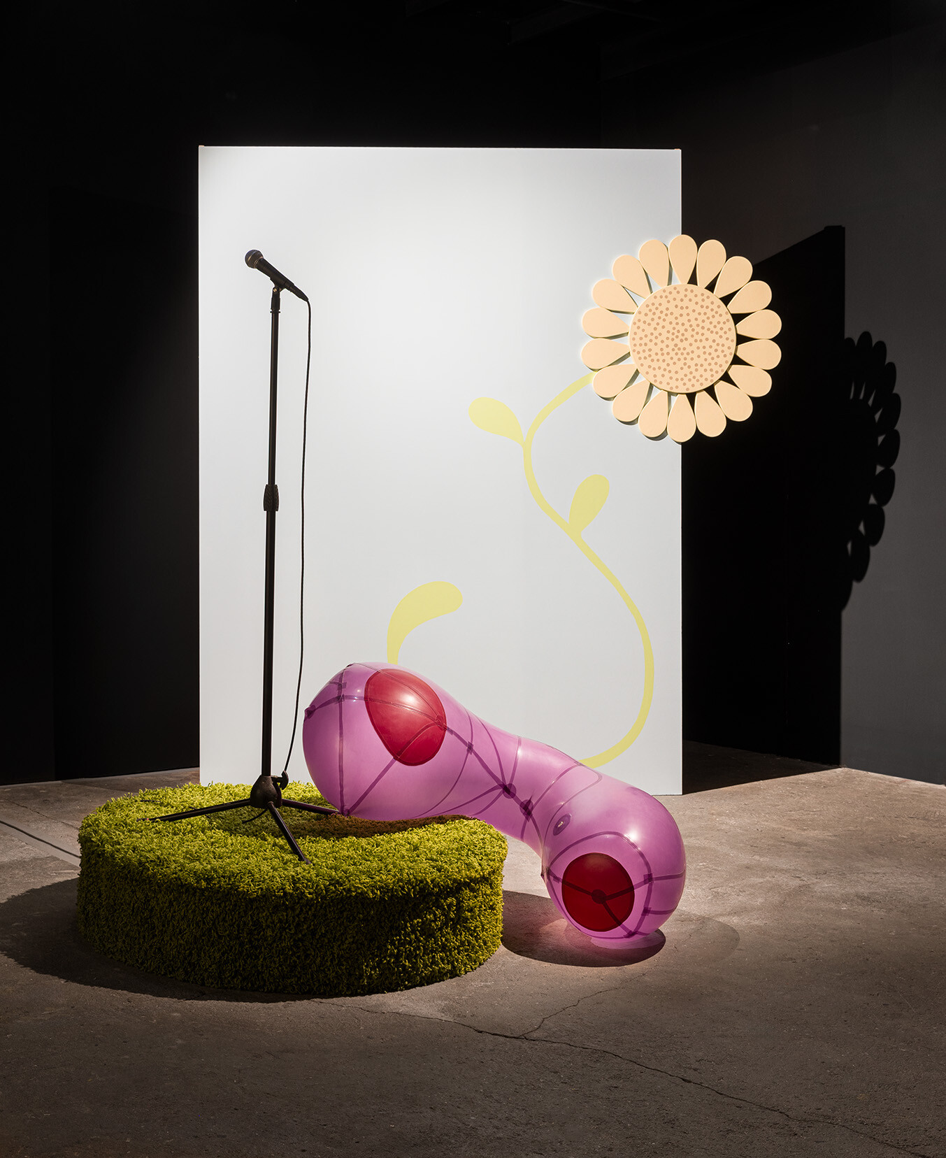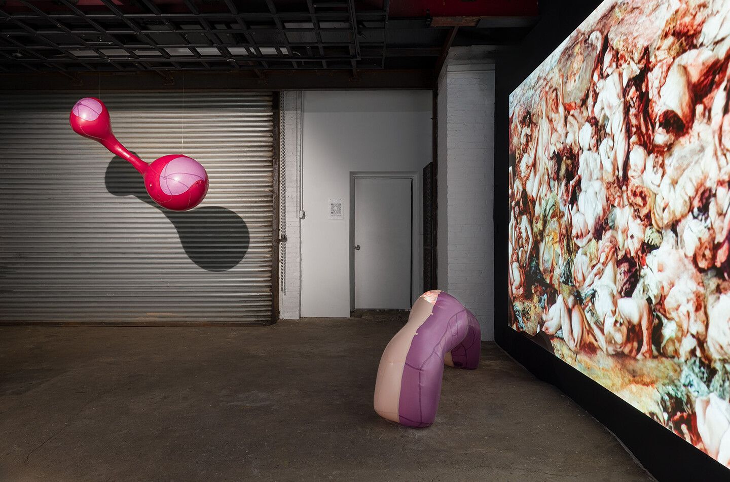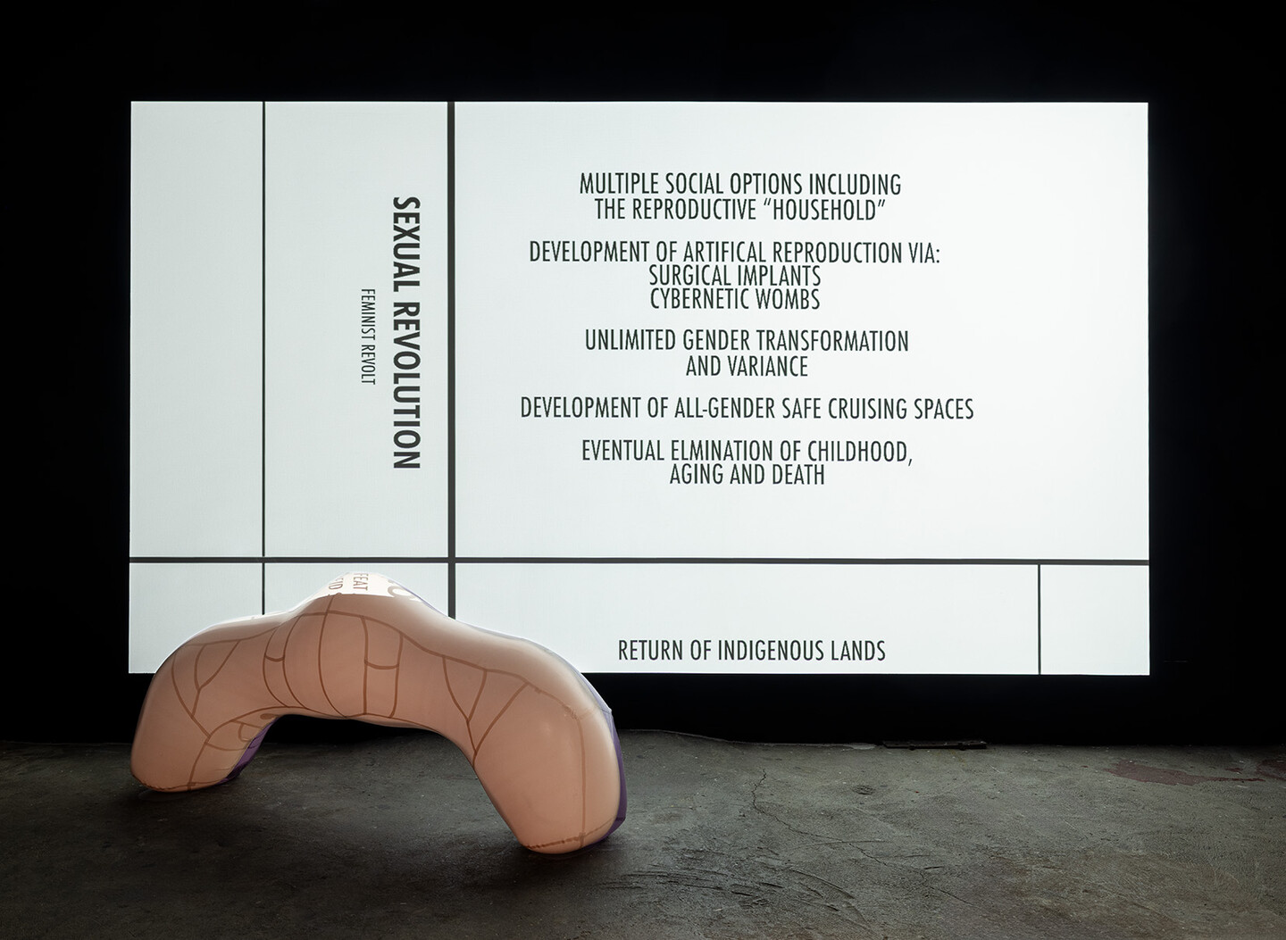 In “The Vanishing Dialectic: Shulamith Firestone and the Future of the Feminist 1970s,” Kathi Weeks suggests that the artificial womb concept in Firestone’s earlier text acts like a novum—a scientifically plausible technological innovation that drives science fiction narratives and their corresponding cognitive estrangement. Ruhl’s installation environment evokes the basis of Firestone’s reproductive utopia with inflatable sculptures that serve both as projection screens and, in the context of performance, as noise-generating instruments.